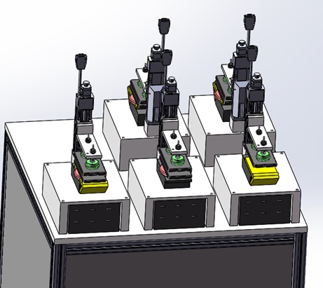 設(shè)備共包含5個工位,各工位模塊化設(shè)計(jì)。每個工位包含升降機(jī)械手、隨行吸附夾具,充電器夾具,切換控制監(jiān)測盒。系統(tǒng)由計(jì)算機(jī)控制,實(shí)現(xiàn)對各工位管控。各工位均具備電壓閾值設(shè)置、電壓通斷控制、電壓監(jiān)測,超壓停止功能。